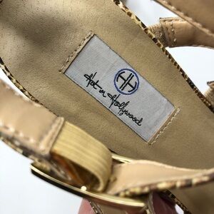 NEW WITHOUT TAGS Hot in Hollywood tan, beige and brown snake skin print summer strappy heeled sandals. They have a thick t-strap design with gladiator style straps up them. They have a cap heel and a fun periwinkle blue/purple sole bottoms. 2 1/4” heel. In excellent like new condition with the only flaws being some stains on the inside brand tag and a few scuffs on the soles from trying them on in store. Please see photos for measurements and details. Women’s size 8M.