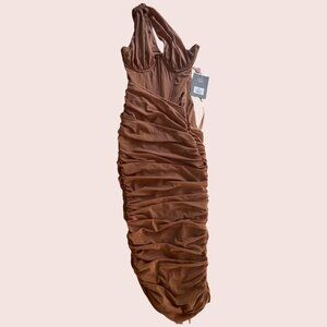 NEW House of CB Valentina Mocha Asymmetric Midi Dress, Size Small