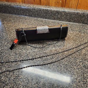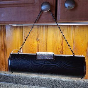 Very petty evening purse hard shell black with rhinestones clasp has cross body chain as well as a hand carry chain great for those special occasions or even a special gift for the holiday season never been used still has tag on.