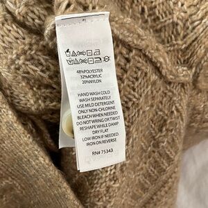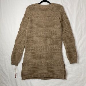 Jessica Simpson Cardigan Sweater. Women's tag size small (see actual measurements in photos). Polyester acrylic nylon blend. Very soft and stretchy. Loose, textured knit. Tan colour. Full button front. Extra long with side slits. Could be worn as a dress. V neck with pockets.