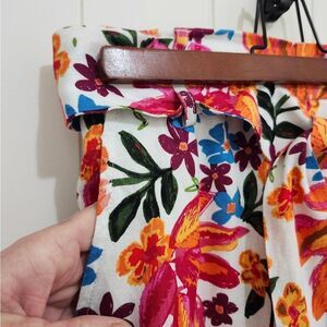 Joie linen blend wide leg crop pant. Orange/pink floral print, belted at the waist with beaded tassels at the ends. Front pockets, back elastic waist.