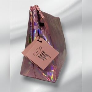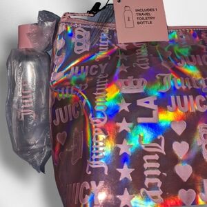 Brand new with tags Juicy Couture Holographic/Iridescent Cosmetic Bag with plastic travel bottle. Measures: 12.5" x 7.75" x 4.5"