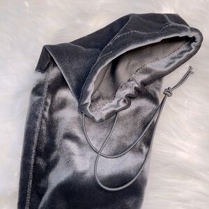 Lavish and super chic wide calf heeled boots in velvety grey colour with adjustable string.