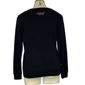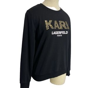 Keywords: Karl Lagerfeld sweatshirt, logo sweater, black gold sweatshirt, XS designer top, Karl Lagerfeld Paris pullover, sequin sweatshirt, Karl Lagerfeld Canada, glam streetwear, XS sweatshirt
