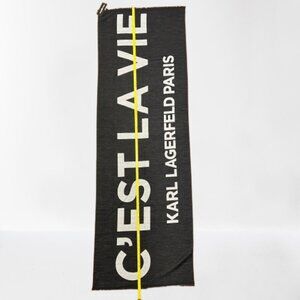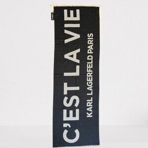 The Karl Lagerfeld Paris scarf features stylish "C'est la vie" lettering—the French phrase for "that's life". This oversized scarf gives a very soft, cozy feel, with fringe detailing and bold KARL LAGERFELD logo.