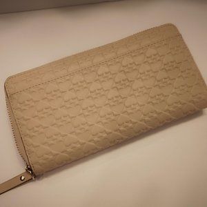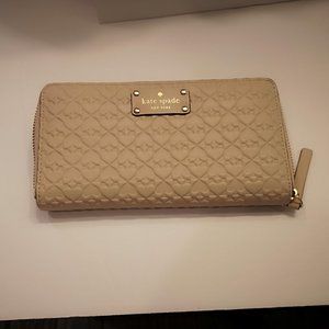 Zip around wallet accented with the Kate Spade name plate on the front and a full length slip pocket on the back