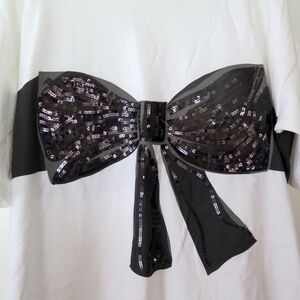 The bow is printed in black and gray and is accented with black sequins. The t-shirt is made of fine 100% cotton and is white in colour.