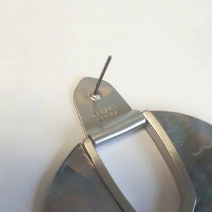 These fab designer statement earrings are NWT. The polished disc of gray MOP shell (sold as "black pearl" by KS) reflects pink, green and turquoise colours depending on the light. Never worn, no flaws, authenticity stamp on back. Comes only with dust bag, card and studs. Unknown matte silver-tone metal. Unique circle geometric design.