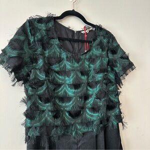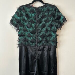 NEW LAFFAIRE Wispy Fringe Metallic Green Top Black Satin Bottom Jumpsuit