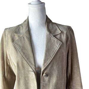 Embrace the quiet luxury trend with this flattering and sophisticated tan suede blazer from New Look. This jacket is the ultimate fall fashion and winter statement piece, designed to elevate your wardrobe and tailored fit. ( 2000-2010 time period) Crafted from genuine suede, the jacket has a beautiful, plush nap in a versatile light tan or camel color.