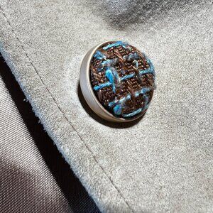 It features a classic blazer silhouette with notched lapels and a single back vent for ease of movement. The true standout detail is the set of four unique, fabric-wrapped buttons with a chic, textured weave in shades of brown and turquoise—a perfect pop of color and edgy detail that makes the blazer feel trendy and custom.