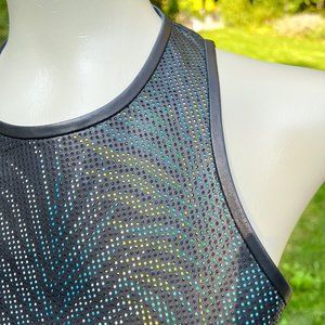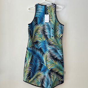 Elevate your style with this stunning perforated black leather dress. It boasts a unique two-layer design that seamlessly combines sophistication with a touch of tropical botanical charm. The inner layer showcases a vibrant tropical botanical pattern, infusing the dress with a burst of color and life.