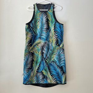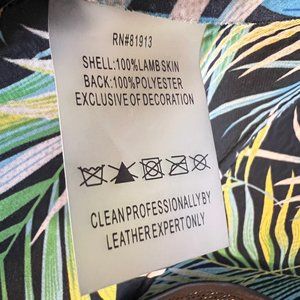 Elevate your style with this stunning perforated black leather dress. It boasts a unique two-layer design that seamlessly combines sophistication with a touch of tropical botanical charm. The inner layer showcases a vibrant tropical botanical pattern, infusing the dress with a burst of color and life.