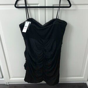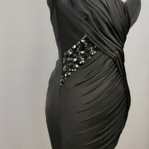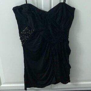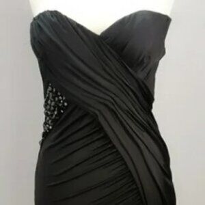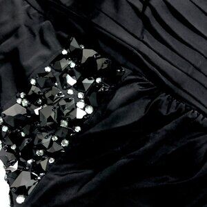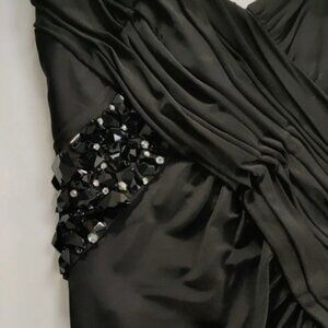 This brand new never been worn Laundry by Shelli Segal Black Ruched Strapless Beaded Wrap Cocktail Dress has an asymmetrical hemline, and a crossover ruched front with right side jeweled detail. Has a side zip, gripper tape on the bust line and is full lined.