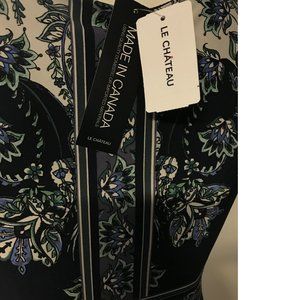 MADE IN CANADA, Original LeChateau hard to find old stock. NWT Stunning and flattering dark blue sleeveless bodycon dress with white/ purple floral parsley design,