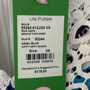 Brand new with tags. The Lilly Pulitzer Brooke Tunic Dress in Hippy Hippy Shake print. Bold blue and white with embroidered edge details. Zippered back. Lined. Regular $178 USD.