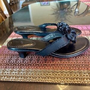 These brand new Lindsay Phillips black thong sandals are adorable. They have a polka dot flower detail on the top of the foot. The side straps are adjustable, ensuring the best possible fit. Simply adjust the Velcro straps. The kitten heel is 1.5” high. These sandals are very versatile. They can be worn casually or styled with a fancier outfit. They take minimal room up when travelling, making them an ideal choice for a holiday.