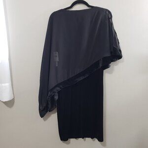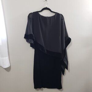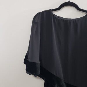 Body of the dress is black stretch velour and the cold shoulder overlay is made of chiffon trimmed in the same velour