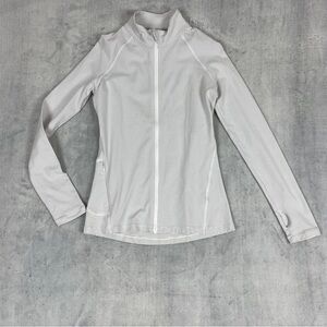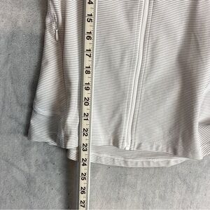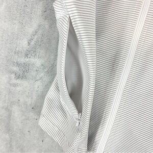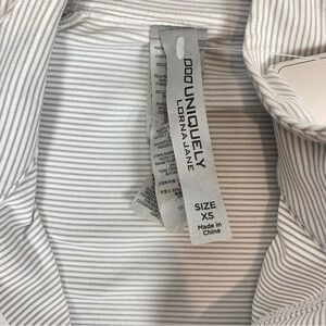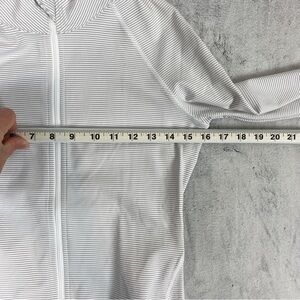 Uniquely Lorna Jane Unwind Zip Through Long Sleeve Top in Galaxy / White Stripe. Women's Size XS. Nylon / Elastane Blend. Soft with lots of stretch. Light grey and white stripe. Activewear jacket. Thumbholes. Zip pocket. Shrink and fade resistant. Moisture wicking and breathable. Quick dry. Shaped design. Workout, walking, biking, running activewear layer.