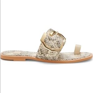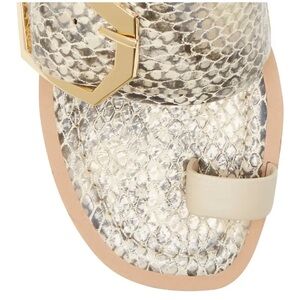 NWT Louise Et Cie snake skin/print leather toe-loop flat sandal with gold buckle.