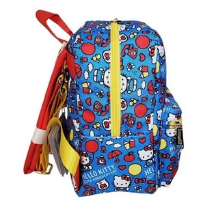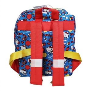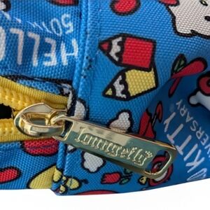 This colorful and lightweight polyester canvas backpack celebrates Hello Kitty's 50th Anniversary with an all-over Hello Kitty and Anniversary logo print.