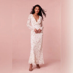 New without tag. Never worn. The main label is missing, the care label is there (see photos). Measurements It's a little hard to measure this, see measurements from the official site below for size 4, size 2 will be just 1-2 inches smaller. Measurements based on Size 4 Length on Body: 56 1/2" Bust: 34 1/8" Waist: 29" High Hip: 38" Low Hip: 41" Sweep: 75 Description Introducing the Dalia Dress. This charming maxi debuts with a crinkle textured chiffon fabric with a sweet dainty floral print. With a bias cut the dress features delicate stripes running throughout with ruffles on the waist. The bodice is ruched adding feminine texture while the slim fit sleeves debut a pretty bell shape. Details 81% Viscose/16% Silk/3% Metallic Lining: 100% Polyester Dry Clean Only