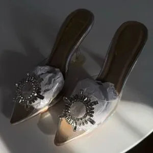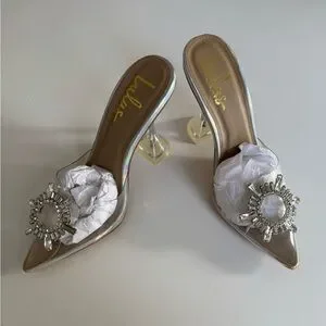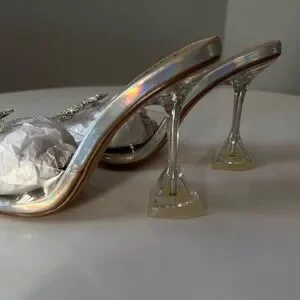 New, never worn, clear, pointed toe, slip-on heels with rhinestone-encrusted embellishment.