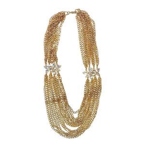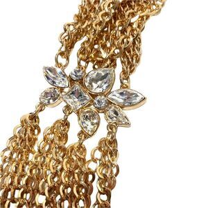 Custom made necklace by Michelle Merizzi, jewelry designer to the stars. Gorgeous gold plated (1/20) multi-chain necklace with 24 bezel set square cut swarovski elements, measuring 8.50 x 8.50 x 0.00mm. Square, Round, Marquise, Pear, Oval shaped. Total weight of necklace is 252.20 grams.