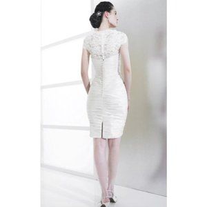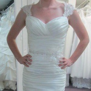 This dress is taffeta and has a sweetheart neckline that comes down to meet a beautifully pleated/ruched fabric fitted sheath that ends at the knee. There are beautiful capped sleeves made with Alencon Lace that covers the upper part of the back of the dress. AB crystals, seed beads, sequins and taffeta covered buttons along the zipper are the finishing touches that complete this gorgeous modern gown that has a very vintage feel. This dress can easily be accessorized with a variety of belts and sashes, as pictured (belt not included). This dress is a size 8 (manufacturer's size chart 35 inch bust, 27 inch waist, 38 inch hip, model measures 5'5, 34.5 inch bust, 27.5 inch waist, 39 inch hip). This dress has been altered as a back up for a dress for a customer, that was uncertain to arrive on time, but did. The dress was professionally let out about 3/4 inch on each side, so there is a little more wiggle room in there! This dress is new for sale and has only been tried on a few times as a floor model. It is in excellent sample condition, but does exhibit pinholes along the sides where it was let out. These were too small to photograph, and are not noticeable. More pics to follow.