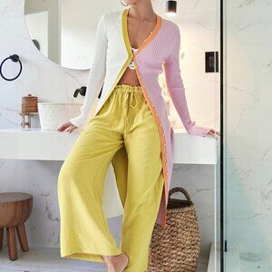 knit dress, cardigan dress, button front dress, ribbed knit cardigan, two tone dress, colorblock cardigan, midi sweater dress, long sleeve knitwear, spring fashion, fall outfit, layering cardigan, chic loungewear, pastel dress, trendy cardigan