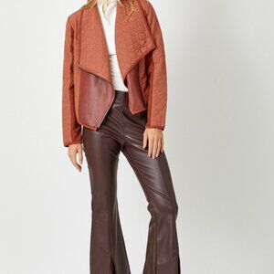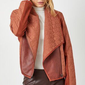 Stylish rust-toned quilted moto jacket with asymmetrical zip front