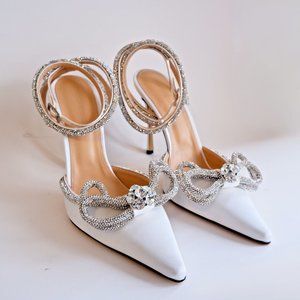 These Mach & Mach double bow heels are covered with their signature hand-applied crystal embellishments. These shows have a lovely white satin upper with crystal accents and coiled ankle straps. The perfect wedding heels, or pop of pizazz with a pair of your favourite cropped jeans.