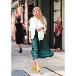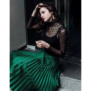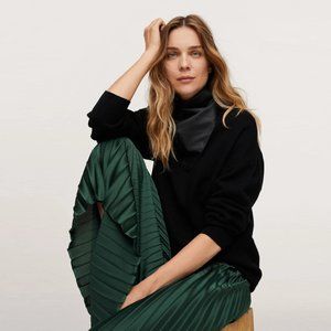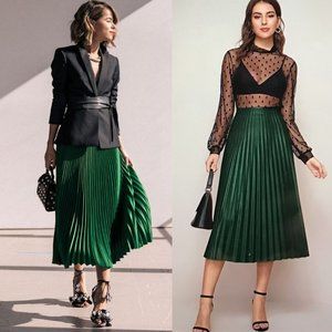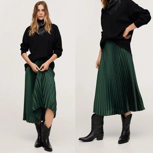 Stunning midi pleated skirt by Mango, a graceful wardrobe essential This skirt has accordion pleats that cascade down to a midi length, creating a fluid and flattering silhouette. The forest green color adds a touch of freshness to any ensemble, while the midi length offers a perfect balance between chic and practicality. Whether dressed up with heels and a blouse for a polished look for office or evenings or paired with sneakers and a casual top for a relaxed weekend vibe, or a pair of boots and a sweater for colder weather, this skirt is a versatile wardrobe staple.