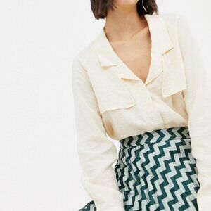 Stylish Ivory oversized top/ blouse, designed with cuffed long raglan sleeves. with a curved hem for a trendy touch. Styled with covered placket and lapel collar, this blouse gives a contemporary twist on a classic silhouette. Its lightweight, crinkled makes it perfect for year-round wear, while its trendy design ensures versatility that complements a wide range of outfits. Wear it with a skirt, a pair of pants, or your favorite jeans, or layer it over a bathing suit as a chic cover-up.