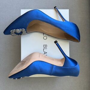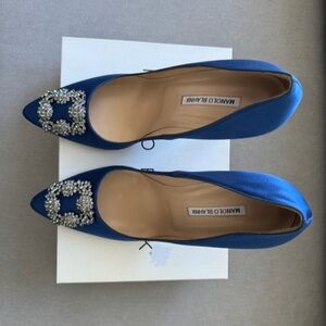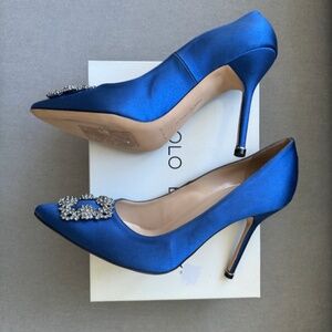 NEW in box, Manolo Blahnik Hangisi 105mm / 4in heel Crystal Buckle Blue Satin Pump Size 42.