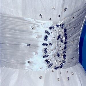 A princess-inspired dress with fitted bodice and tulle skirt. Glittering stones as embellishment on the side of the ruffled bodice. You can wear it with strap or strapless
