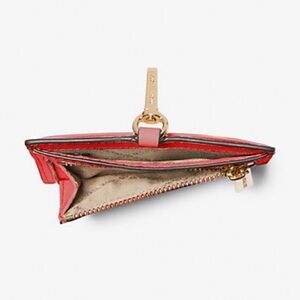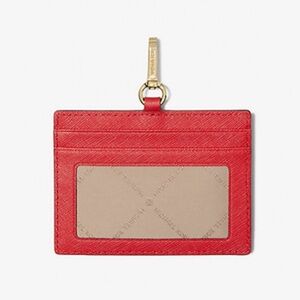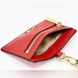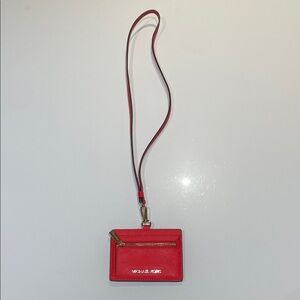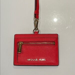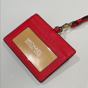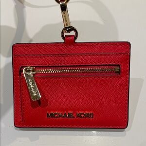 Elegant Michael Kors card holder in striking scarlet. Features a convenient lanyard for easy access.