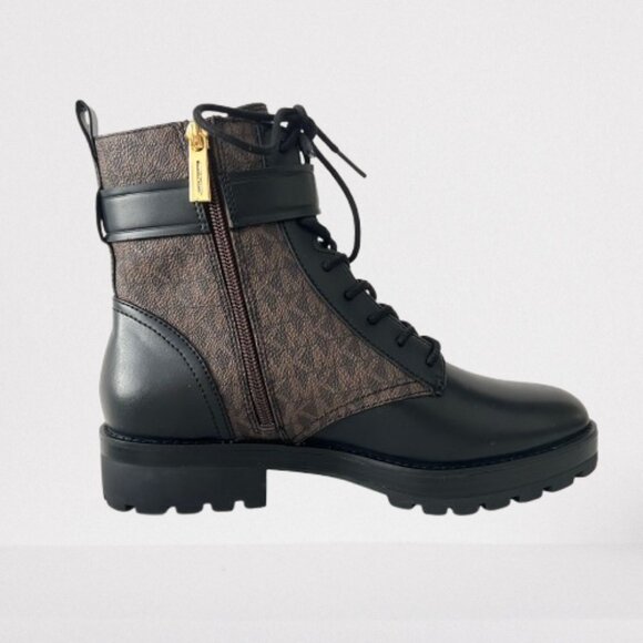 Michael Kors LOGO combat moto boot/booties combines smooth faux leather and Signature-print canvas to create a shoe that’s hard-working yet chic. This lace-up pair features a side zip fastening for easy wear, while a rubber tread sole ensures traction on slick streets. Put yours on display with mini or midi hemlines.
