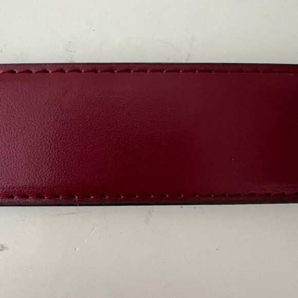 One side is in smooth beautiful burgundy finish and the other side in two tone brown with MK monogram pattern . The buckle can be removed to trim the belt to length. Instructions attached to the belt, see photo.