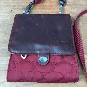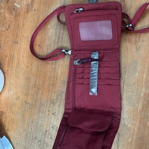 Very practical for sightseeing and travel as it wraps across the body and can be worn in the front . Lightweight burgundy red.