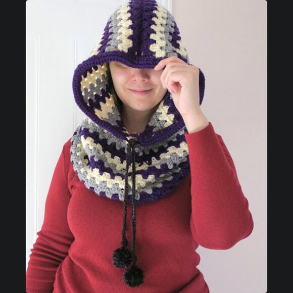 NEW NWOT Handmade Crochet Hooded Cowl with pompoms - Machine-Washable Acrylic