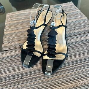 These *NEW Nine West Black Satin Sandals with a Ruffle on the top of the foot are beautiful. They have an ankle strap. They are a size 10. The heel is 3.5” in height. These sandals are dainty and very pretty.