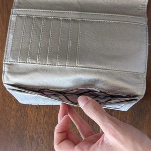 Red exterior with metallic silver interior and fun patterned lining in pockets.