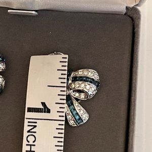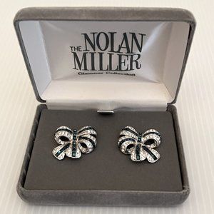 New without tags in perfect condition - a pair of vintage clip-on Nolan Miller earrings in the shape of bows, stylized with blue and white rhinestones. Approx. 1"x1". Comes with the box and certificate of authenticity.