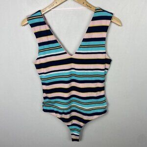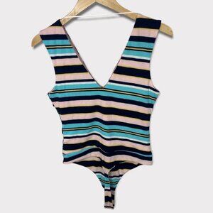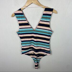 NEW Nordstrom AFRM Striped Bodysuit Double V Light Pastel Pink Blue Retro Medium