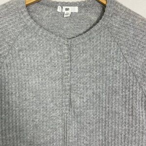 Nordstrom BP Oversized Snap Front Henley Long Sleeve in Grey Heather and Women's Size XS. Retails for $35 USD (approximately $49 CAD). Every closet needs this classic waffle-knit henley topped with silvery snaps and finished with a tuckable curved hem. 68% poly, 30% rayon and 2% spandex. Machine washable. Made in China. Brand new without tags! No visible flaws but note that tag cut to prevent store returns.