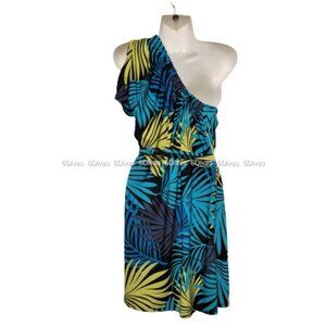 NEW One Shoulder Sexy Blue and Yellow Tropical Palms Print Summer Dress