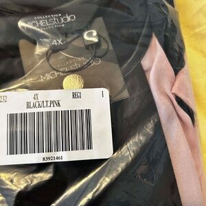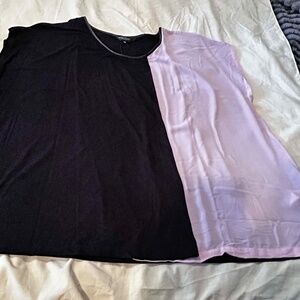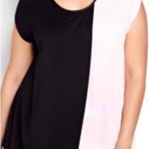 NEW PHOTOS! CAP SLEEVE TOP, BLACK & PINK, SIZE 4X, VERTICAL COLOUR BLOCK, JERSEY & CREPE, SCOOP NECK WITH FAUX LEATHER TRIM, SHIRT TAIL HEM, ADDITION ELLE, IN ORIGINAL BAG, TAG ON, NEVER WORN