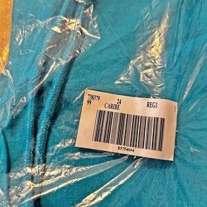NEW PHOTOS! CAPRIS, STRETCH LINEN, CARIBE BLUE, SIZE 24, FRONT ZIPPER, POCKETS, FRONT DRAWSTRING, ADDITION ELLE, IN ORIGINAL BAG, TAGS ON, NEW NEVER WORN