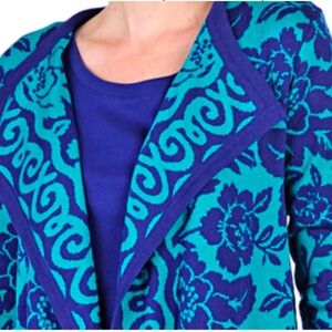 NEW PHOTOS! JACKET, BLANKET SWEATER, ROYAL BLUE/TEAL, SZ 3X, GRAPHIC FLORAL, COTTON RAYON NYLON, OPEN FRONT, ISAAC MIZRAHI LIVE, IN ORIGINAL BAG, TAGS ON, NEVER WORN